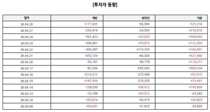 수급 측면에서는 외국인과 기관이 동시에 매도 우위를 보이며 주가 하락을 주도했다. 특히 기관의 연속적인 매도는 단기 수급 부담 요인으로 작용하고 있으며, 개인 투자자 중심의 방어적 매수만으로는 반등 탄력이 제한되는 모습이다.