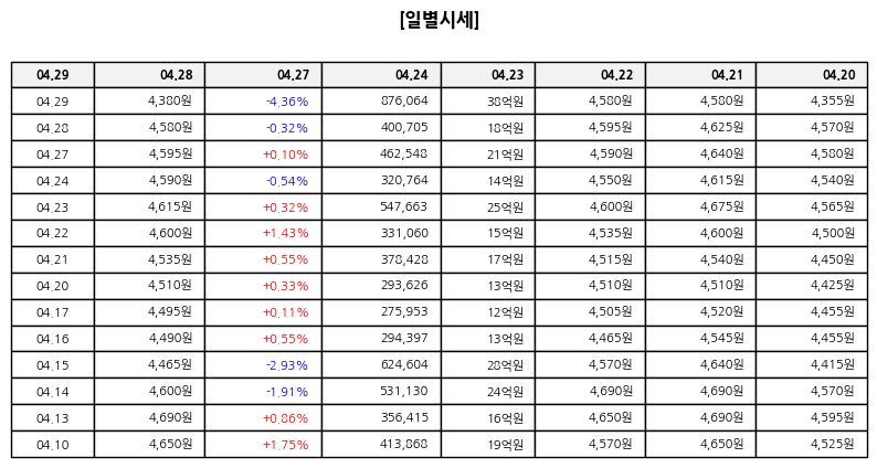 ▷ 오늘 종가는 전일 대비 하락 마감했으며 하락률 상위 종목에 포함될 만큼 낙폭이 컸다. 장 초반 약보합 출발 후 오전 중반부터 낙폭이 확대되었고 오후에는 외국인 매도세까지 겹치며 저점 부근까지 밀렸다. 종가 기준으로는 일부 낙폭을 회복했지만 전체 흐름은 하락 추세가 유지된 상태다.