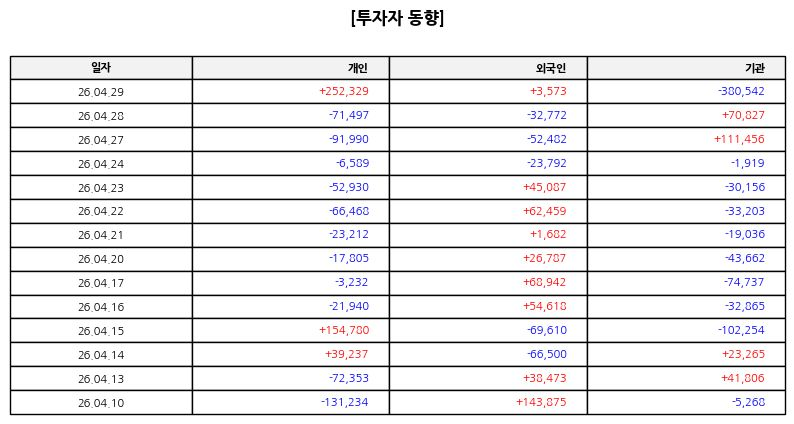 수급 측면에서는 기관이 지속적인 순매도를 보이며 주가 하락을 주도했고, 외국인 역시 동반 매도 흐름을 나타냈다. 개인 투자자들의 저가 매수세가 일부 유입되었지만 전체적인 흐름을 반전시키기에는 부족한 수준이었다. 이러한 수급 구조는 단기적으로 추가 변동성을 높일 가능성이 있다.