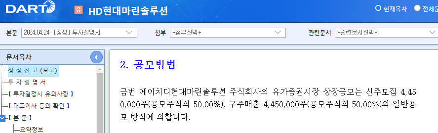 위의 예시에서 보듯 공모주식수 890만 주 중 절반(445만 주)이. 이는 HD현대마린솔루션의 2대 주주인 Global Vessel Solutions, L.P. (Kolhberg Kravis Roberts (KKR)이 운용)가 보유한 15201520만 주 중 445445만 주를 구주매출로 내놓은 것입니다. 전체 공모주 대비 50%에 달하며 상당히 높은 편이라고 볼 수 있을 것 같습니다. 이런 이유로 상장일 초반 매도세가 계속 이어졌던 것은 아니었는지 생각해 보게 됩니다.