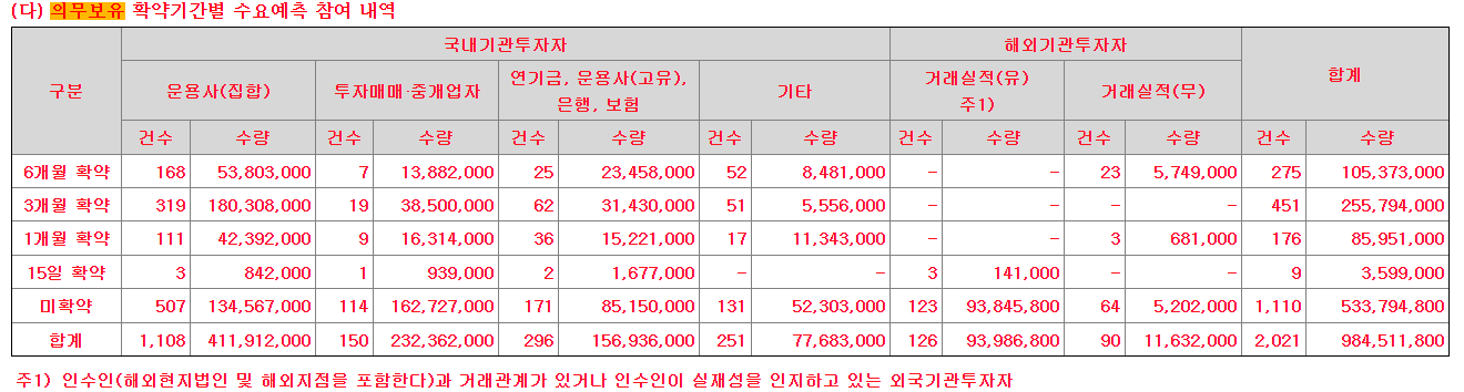 위의 예시처럼 DART(전자공시시스템)에서 투자설명서를 통해 기관별 의무보유 확약 기관수와 신청 수량을 확인할 수 있습니다.