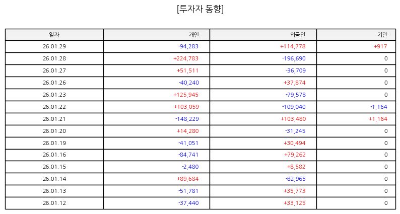 ▷ 최근 주가는 단기 이동평균선을 하향 이탈하며 약세 흐름을 보이고 있다. 거래량은 증가했으나 하락 구간에서 집중된 점은 매도 우위 국면을 시사한다. 단기 지지선 이탈 이후 추가 조정 가능성이 존재하며 추세 전환을 위해서는 거래량을 동반한 반등이 필요하다. 중기적으로는 박스권 하단 부근에서 방향성을 탐색하는 국면으로 해석된다.
