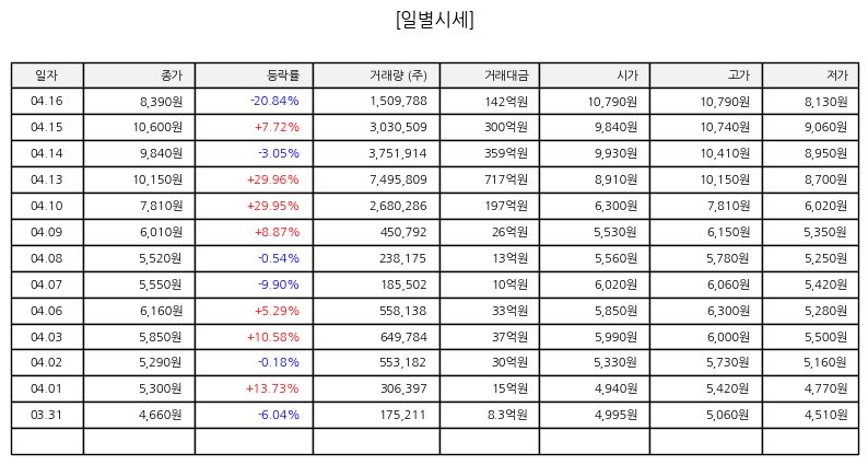 ▷ 2026년 04월 16일 기준 종가는 8390원으로 전일 대비 2210원 하락하며 -20.85퍼센트 급락 마감했다. 장중 고가 10790원 대비 큰 폭의 하락을 기록하며 전형적인 급등 후 급락 패턴을 나타냈다. 거래량은 크게 증가했으나 매도 우위 흐름이 뚜렷하게 나타났으며 단기 고점 형성 가능성이 제기되는 구간이다.