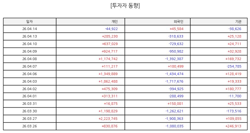 수급 측면에서는 개인 투자자 비중이 높은 가운데 외국인 매도세가 이어지는 모습이 확인된다. 이는 단기 상승 이후 기관과 외국인의 이탈이 동시에 나타나는 전형적인 조정 패턴으로 해석할 수 있다. 특히 단기 급등 이후 거래량이 증가하며 하락했다는 점은 기술적으로도 부담 요소로 작용한다.