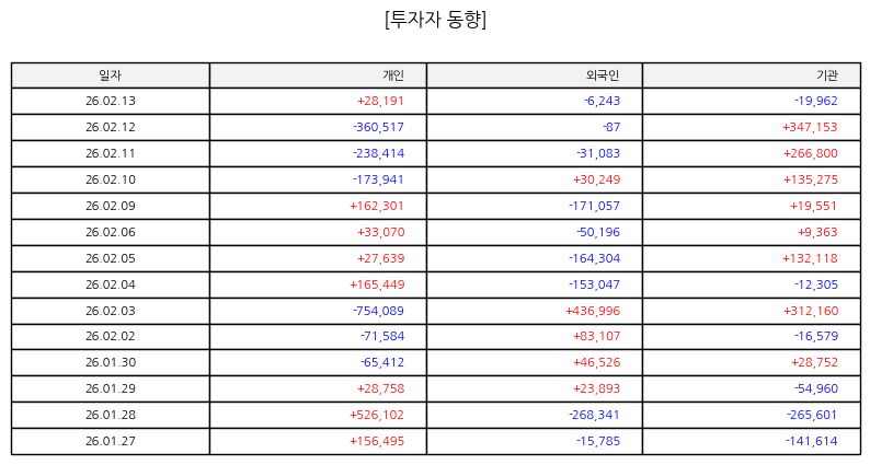 기관 순매수는 단기 수급 개선 신호로 해석할 수 있다. 특히 외국인과 기관이 동시에 매수세를 보일 경우 추세 전환 가능성이 높아진다. 다만 단기 급등 구간에서는 차익 실현 매물 출회 가능성도 존재하므로 거래량과 이동평균선 지지 여부를 함께 살필 필요가 있다.