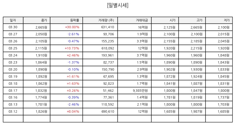 ▷ 오늘 멕아이씨에스는 가격제한폭까지 상승하며 전일 대비 약 30퍼센트 상승한 상한가로 마감했다. 장 초반부터 강한 매수세가 집중되었고, 거래량이 급증하면서 투자자 관심이 크게 확대된 모습이다. 장중 내내 매수 우위 흐름이 유지되며 변동성 없이 상한가가 유지된 점이 특징이다.
