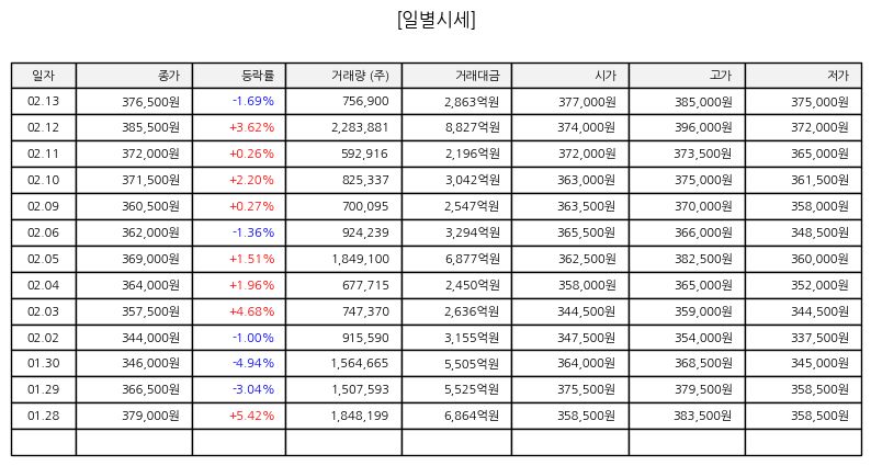 ▷ 일봉 기준으로 최근 조정 구간 이후 저점을 높이며 반등 시도가 나타나고 있다. 단기 이동평균선이 수렴하는 구간에서 외국인 매수세가 유입되며 기술적 반등 신호가 형성되는 모습이다. 거래량 증가와 함께 상승 마감이 이어질 경우 단기 추세 전환 가능성도 열려 있다. 다만 상단 매물대 돌파 여부가 추가 상승의 관건이 될 전망이다.