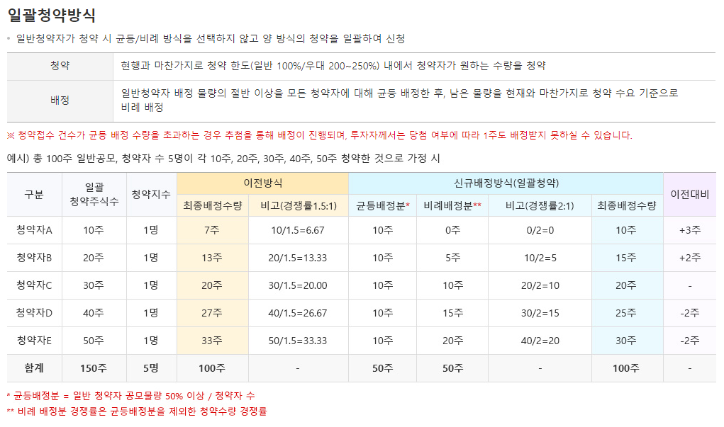 일반청약자 청약은 이렇게 일괄청약방식 외에 분리청약방식, 다중청약방식 등의 방법으로 배정되기도 합니다. 상기 변경된 청약방식은 202012월 최초 증권신고서 제출분부터 적용되었으며, 실제 청약은 발행회사와 대표주관사의 상호 협의 하에 결정된 하나의 청약방식으로 진행되므로 투자자는 적용되는 청약방식에 대해 사전에 확인해 볼 필요가 있습니다.