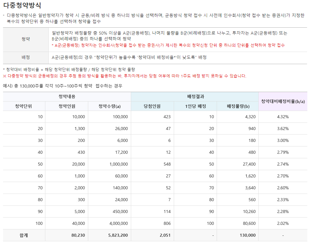 일반청약자가 청약 시 균등/비례 방식 중 하나의 방식을 선택하여 신청하되, 균등방식 청약 접수 시 사전에 인수회사(청약 접수받는 증권사)가 지정한 하나의 청약 단위로 청약을 접수는 방식입니다.