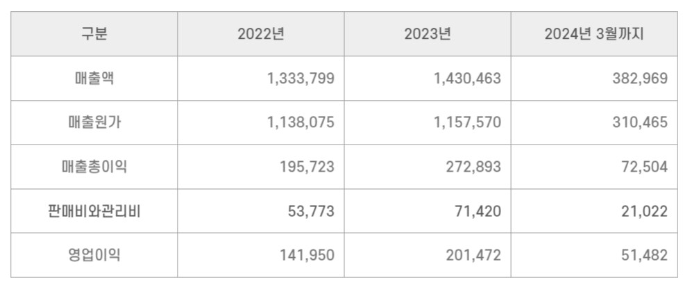2023년도 기준으로 매출이 1조 4305억 원을 기록하며 꾸준히 상승하는 모습을 보이고 있고 영업이익 또한 2015억 원으로 계속 성장하는 모습을 보여 주고 있으며 향후 매출도 호조를 보일 것으로 예상되고 있습니다.