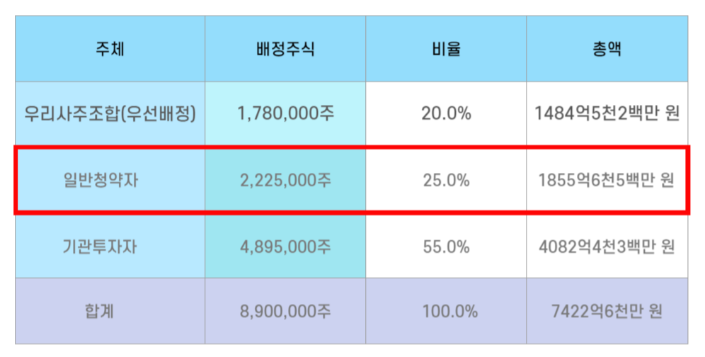 IPO 최대어라 불리며 시장의 많은 관심을 받는 공모주이다 보니 경쟁률이 높을 것으로 예상됩니다. 그렇기에 청약마감일까지 어느 곳이 1인당 균등 배정 수량이 유리한 지 체크하며 청약을 진행하는 것도 좋은 방법이 될 것 같습니다.