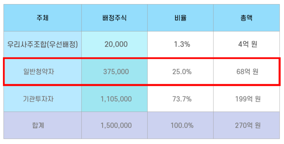 이번  공모주 배정 물량 150만 주 중 일반청약자에게 배정된 물량은 37만 5천 주입니다.