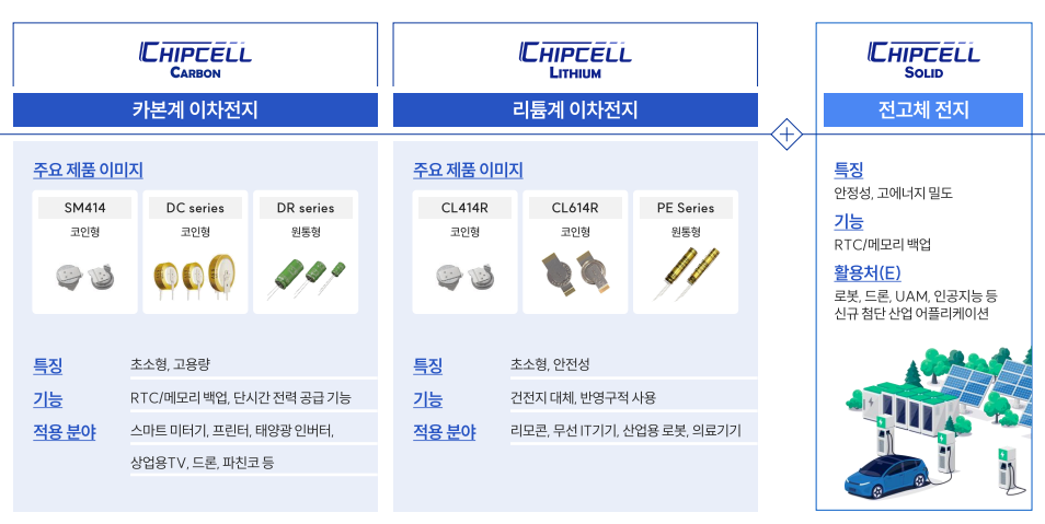 특히 초소형 전지 제조에 특화된 기술적 진입장벽 및 최적의 생산 인프라 등을 갖추고 글로벌 네트워크 등의 경쟁력을 기반으로 초소형 이차전지 분야를 선도하고 있으며 생산하는 주요 제품은 아래와 같습니다.