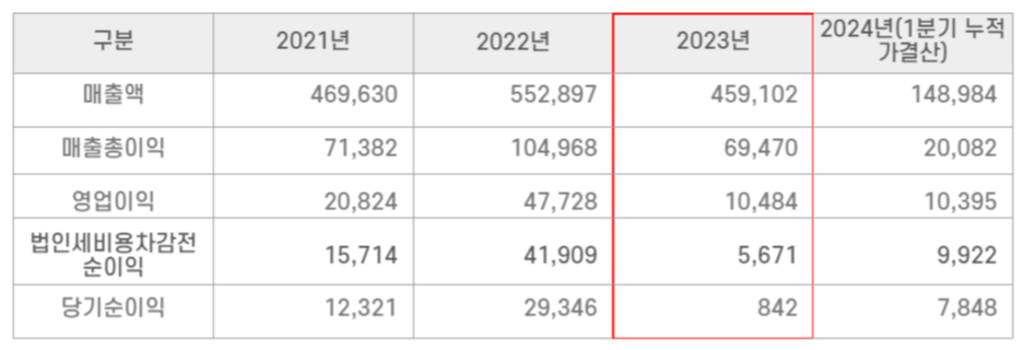 2021COVID-19 이후 영업 재개로 2019년 수준의 매출을 회복하였고, 2022년에는 매출액이 전년 대비 17.73%, 5,529억 원으로 성장하였으나 2023년의 경우 상반기 주용 판매시장인 미국의 소비경제 악화로 고객사의 소비실적 감소 등의 영향으로 매출액이 16.96% 감소하며 역성장을 기록하였습니다. 경기변동에 민감한 산업의 특성이 드러나는 부분입니다.