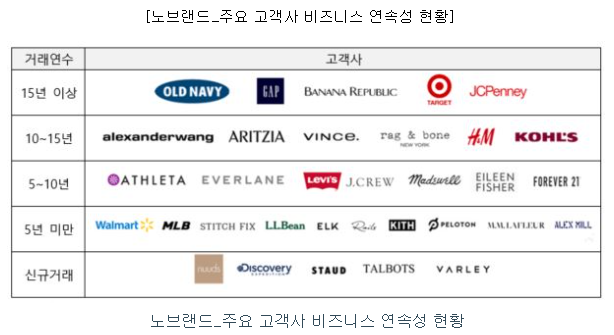 Gap, J.C. Penney, Target 등 대량생산 상품 중심의 고객사들과 20년 이상 거래를 지속해오고 있으며, Helmut Lang, Alexander Wang 등의 고가 디자이너 브랜드와 더불어 Nuuds, Stitch Fix와 같은 온라인, SNS 기반 브랜드 등 넓은 스펙트럼의 고객사를 보유하고 있습니다.