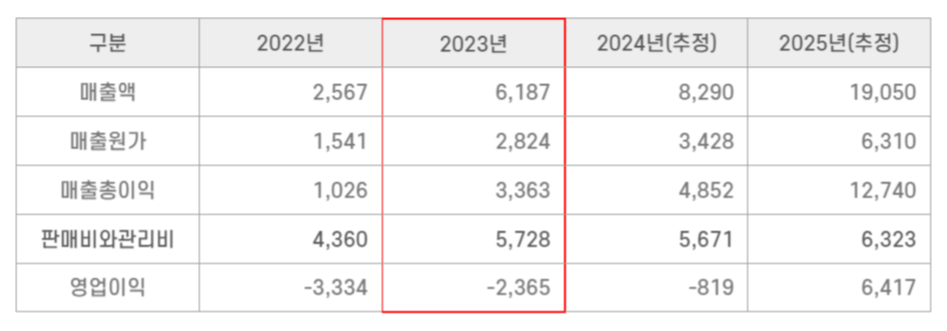 2024년 3월까지 매출액 5.2억 원, 영업손실 14.9억 원 및 당기순손실 14.8억 원의 실적이 예상되나 지속적으로 매출이 발생하고 있습니다. 다만, 2024년 예상 매출액은 약 83억 원이나 3월까지 매출 실적은 5.2억 원에 불과합니다. 2025년에는 흑자전환이 가능할 것으로 예상하고 있습니다.