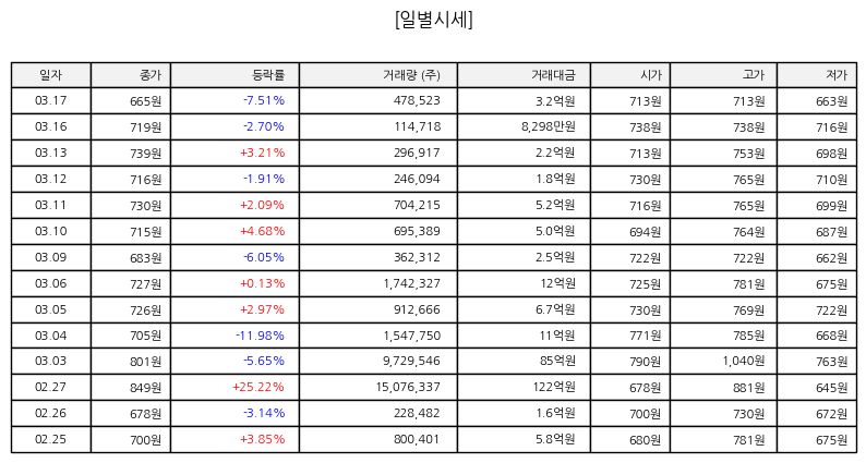▷ 오늘 페이퍼코리아는 장 초반부터 매도세가 강하게 유입되며 하락 출발했고, 장중 반등 시도가 있었으나 매물 부담을 이겨내지 못하고 다시 낙폭이 확대됐다. 종가 기준으로도 전일 대비 큰 폭의 하락률을 기록하며 하락률 상위 종목에 포함되었다. 거래량은 증가하며 투자자들의 이탈 흐름이 확인되었다.