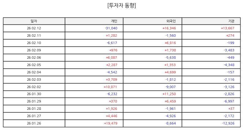 ▷ 최근 일봉 차트 기준으로 보면 박스권 하단에서 반등이 나타난 이후 단기 이동평균선을 상향 돌파하는 흐름이 전개되고 있다. 거래량이 동반된 양봉 출현은 단기 추세 전환 가능성을 시사한다. 다만 과거 고점 부근에서는 매물 부담이 존재할 수 있어 해당 구간 돌파 여부가 추가 상승의 관건이 될 전망이다. 단기 지지선은 최근 형성된 저점 구간이며, 이탈 시에는 재차 조정 가능성도 열어두어야 한다.