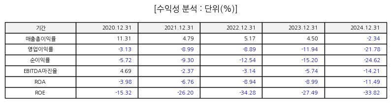 재무 구조를 보면 최근 실적은 매출 감소와 함께 영업손실 및 당기순손실이 이어지고 있다. 2024년 매출 규모는 약 334억원으로 전년 대비 감소했고 영업이익과 순이익 모두 적자를 기록했다. 부채비율이 높은 수준을 유지하고 있어 재무 안정성 측면에서도 부담 요인이 남아 있다. 수익성 지표는 영업이익률과 순이익률이 마이너스 구간으로 지속돼 투자 매력 저하 요인으로 작용한다.