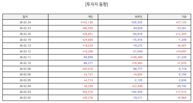 ▷ 금일 주가는 갭 하락으로 출발한 뒤 장중 추가 하락이 이어지며 약세 흐름이 지속됐다. 단기 이동평균선 아래에서 거래가 이뤄지며 기술적 부담이 커진 상태다. 거래량이 동반된 하락이라는 점에서 단기 추세 전환 신호가 나오기 전까지는 보수적 시각이 우세할 가능성이 높다. 주요 지지 구간 이탈 여부와 거래량 감소 전환이 향후 반등의 1차 확인 신호가 될 전망이다.