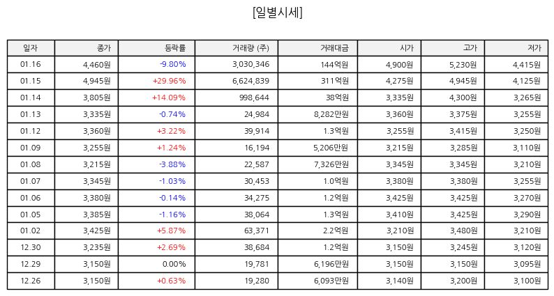▷ 오늘 주가는 전일 대비 하락 출발한 이후 장중 매도세가 강화되며 낙폭을 키웠다. 거래량은 평소 대비 증가했으나 매수보다는 매도 우위 흐름이 뚜렷했다. 종가는 저가권에서 형성되며 단기 약세 신호를 남겼고 투자자들의 관망 심리가 강해진 하루였다.