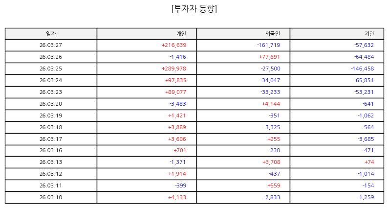 ▷ 금일 주가는 장 초반 약세로 시작한 이후 반등 시도 없이 지속적으로 하락 압력이 이어졌다. 기관과 외국인의 동반 매도가 출회되며 낙폭이 확대되었고, 개인 매수세가 일부 유입되었으나 하락 흐름을 되돌리기에는 부족한 모습이었다. 단기적으로는 지지선 형성 여부가 중요한 구간이며 추가 하락 시 변동성 확대 가능성이 존재한다.
