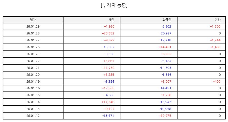 ▷ 최근 주가는 고점 이후 점진적인 하락 추세를 보이며 이동평균선 아래에서 거래되고 있다. 거래량은 이전 대비 줄어든 상태로 매수와 매도 모두 관망 기조가 강하다. 단기 반등 시도가 나타나더라도 추세 전환 여부는 추가적인 거래량 동반이 필요한 구간으로 판단된다.