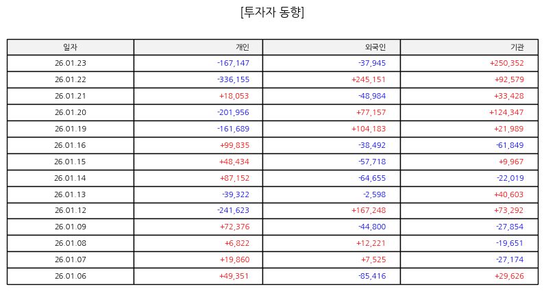 ▷ 최근 주가 흐름은 급격한 반등보다는 저점 확인 이후 완만한 회복 시도를 보이고 있다. 이동 구간에서 거래량이 안정적으로 유지되고 있으며 기관 매수 구간에서는 하락 탄력이 둔화되는 특징이 나타난다. 중기 관점에서는 추세 전환 여부를 판단하기 위한 에너지 축적 구간으로 해석할 수 있다. 단기 매매보다는 분할 관점의 접근이 상대적으로 유리한 구간으로 평가된다.