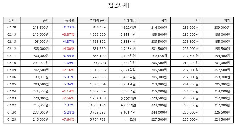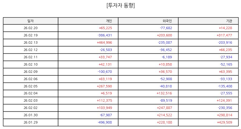 ▷ 최근 일봉 흐름을 보면 고점 대비 조정을 거친 뒤 저점 구간에서 횡보 흐름을 이어가는 모습이다. 이동평균선 간 이격이 줄어들며 단기 바닥 다지기 양상이 나타나고 있고, 거래량이 점진적으로 증가하는 구간에서 기관 매수세가 유입되고 있다. 단기 저항선 돌파 여부가 향후 반등 강도를 결정할 변수로 보이며, 지지선 이탈 시에는 추가 변동성 확대 가능성도 염두에 둘 필요가 있다.