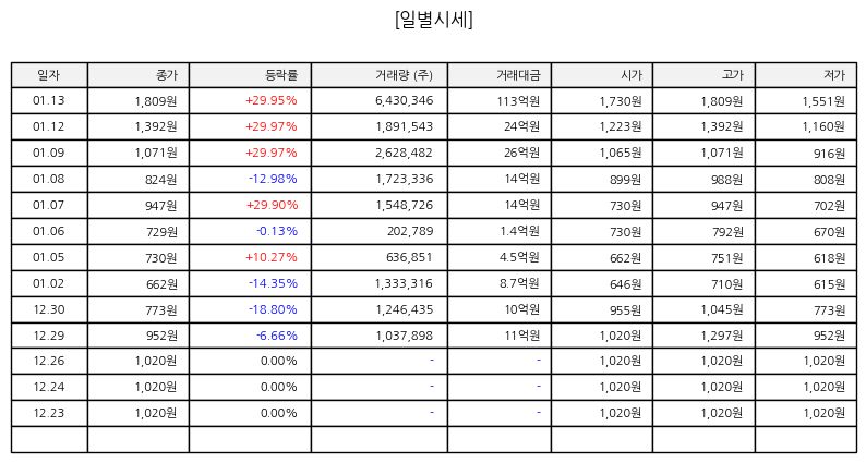 ▷ 마지막 거래일 주가는 시가 대비 하락 출발 이후 장중 반등을 시도했으나 강한 매수세는 제한적이었다 종가는 장중 저점 대비 소폭 회복된 수준에서 형성되며 단기 불확실성이 이어지는 흐름을 보였다 거래량 증가는 단기 관심도를 반영하지만 추세 전환으로 해석하기에는 추가 확인이 필요하다