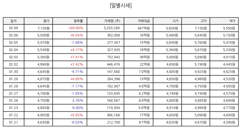 ▷ 금일 주가는 시초가 이후 강한 매수세가 유입되며 빠르게 상승했다. 장 초반부터 거래량이 크게 늘었고 매도 물량을 소화하며 가격이 단계적으로 올라 상한가에 도달했다. 이후 장 마감까지 상한가 수준에서 거래가 유지되며 투자자 관심이 집중된 하루였다.