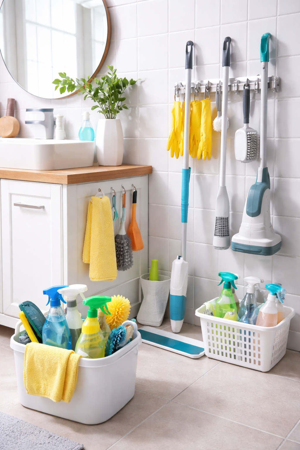 (1) 욕실 청소 도구 배치는 사용 빈도를 기준으로 나누는 것이 핵심이다. 매일 사용하는 스퀴지와 변기솔은 가장 접근성이 좋은 위치에 두고 주간 단위로 사용하는 브러시와 세정제는 한 단계 뒤쪽에 배치한다. 사용 빈도에 따른 거리 조절은 꺼내고 넣는 동작을 줄여 청소 시작의 심리적 부담을 낮춘다. 손을 뻗었을 때 바로 잡히는 구조는 짧은 청소를 자주 하게 만드는 동기가 된다.