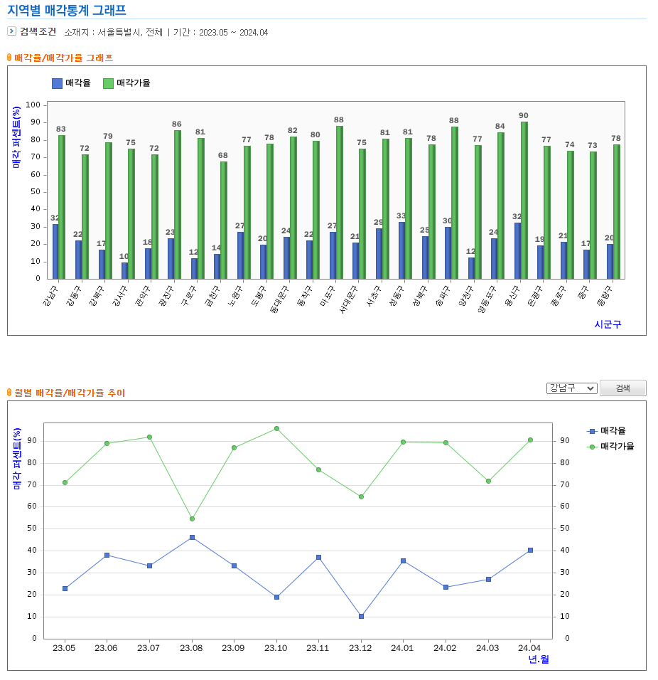 2023년 5월부터 2024년 4월까지의 서울시의 지역별 매각통계를 확인해 보면 대략 70~90% 사이에서 매각가율이 정해지는 것을 볼 수 있습니다.