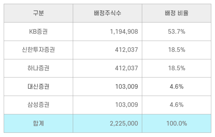 각 증권사별로 배정된 주식수는 다음과 같습니다.