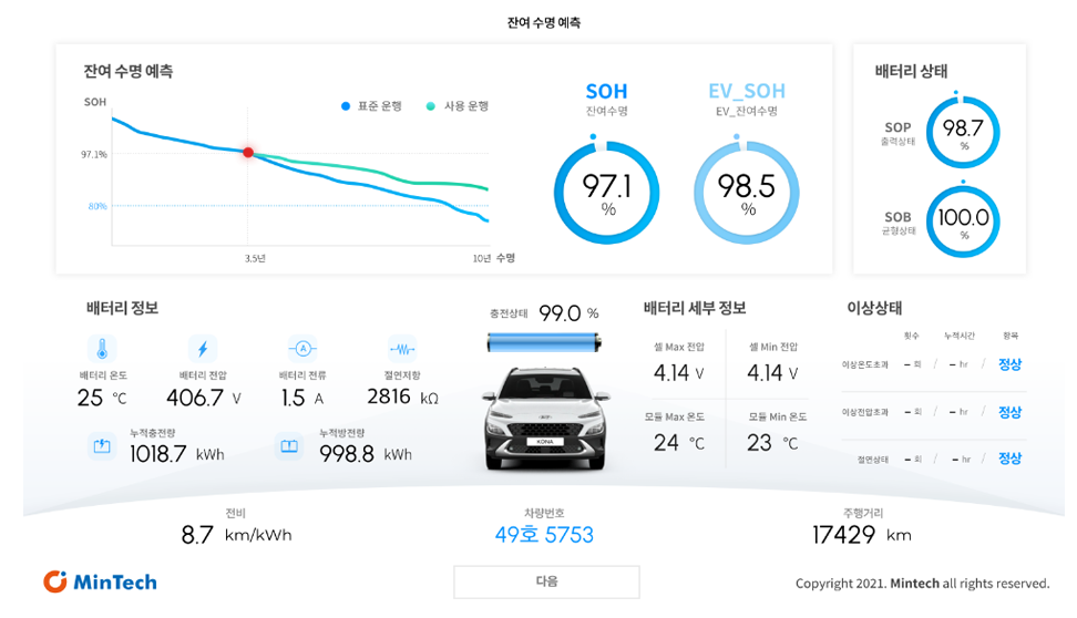 또한 기존 배터리 셀 진단 테스트의 경우 다양한 시험을 개별적으로 실시하고 데이터를 별도로 편집, 관리해야 하는 어려움이 있던 것을 통합 S/W에서 ONE STEP으로 진행하도록 하여 기존 테스트에서 10일 이상 걸렸던 공정을 3일 이하로 줄이고 미세불량을 검출 가능케 하는 기술력을 보유하게 되었으며, EV, ESS 사용 중 배터리 진단 시에는 배터리 분해 없이 운용 중인 상태에서 진단이 가능하며, 15분 이내 신속진단과 이상원인 추정이 가능하도록 하여 배터리 사용자의 유지관리비용을 절감할 수 있도록 하였으며, 사용 후 배터리의 경우 1일 진단능력을 향상하여 진단 비용이 최대 90%를 감소하도록 하였으며 종합적인 상태진단을 통한 등급 판정을 이루어 냈습니다.