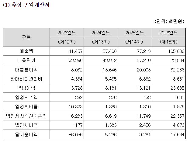 매출액은 꾸준히 증가하고 있으나 현재는 적자 상태입니다. 회사는 2024년부터 흑자로 전환하고 2026년부터 는 본격적으로 우주 항공 분야의 매출이 커질 것으로 예상하고 있으나 상장 이후의 실적 예측을 100% 확신할 수는 없기에 이 부분은 보수적으로 보는 것이 좋을 것 같습니다.